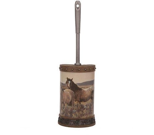 Revamp your restroom with this handsome Mustang Horses design. This Toilet Bowl Brush / Holder depicts a pack of beautiful wild horses in a windy field. Clever studded "wood" accent surrounds the perimeter. Brush IS included.